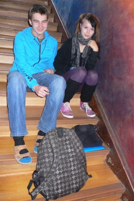 Pri tomto obrázku, kde si starší žiak pozerá zošit mladšej žiačky odznelo od spolužiačky staršieho spolužiaka: "Ty sa učíš? Čo máme písomku?"