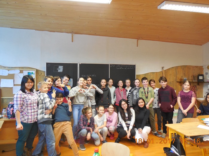 V rámci projektu Educate Slovakia zameraného na medzi-kultúrne porozumenie, nás minulý týždeň navštívili stážistky zo študentskej organizácie AIESEC a podelili sa so žiakmi o svoju kultúru. Študentky boli z Lotyšska, Číny, Indonézie a Malajzie a ich rozprávanie vzbudilo u detí záujem, ba mnohé mali o týchto krajinách veľa vedomostí, čo zas potešilo študentky. Deti mali možnosť dozvedieť sa o typických jedlách, exotických zvieratách a ovocí, o tropických pralesoch, suchých a daždivých obdobiach, o Paríži severu (Riga) a o mnohých ďalších zaujímavostiach. Katrina z Lotyšska naučila naše deti lotyšský národný tanec, Vivian z Číny učila deti jesť paličkami. Bol to týždeň plný exotiky, dialógov, otázok a zábavných situácií. Pre stážistky to bol prvý kontakt s Európou a s výučbou detí inej kultúry. Ich záverečné správy sú plné chváľ: